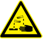 Corrosive: Corrosive material can damage your skin and some types of metal. Some cleaners and acids commonly used in schools are corrosive, such as hydrochloric acid and ammonia. Corrosive materials can react with water and cause burns. Therefore you need to use non-reactive protection gear. | |
